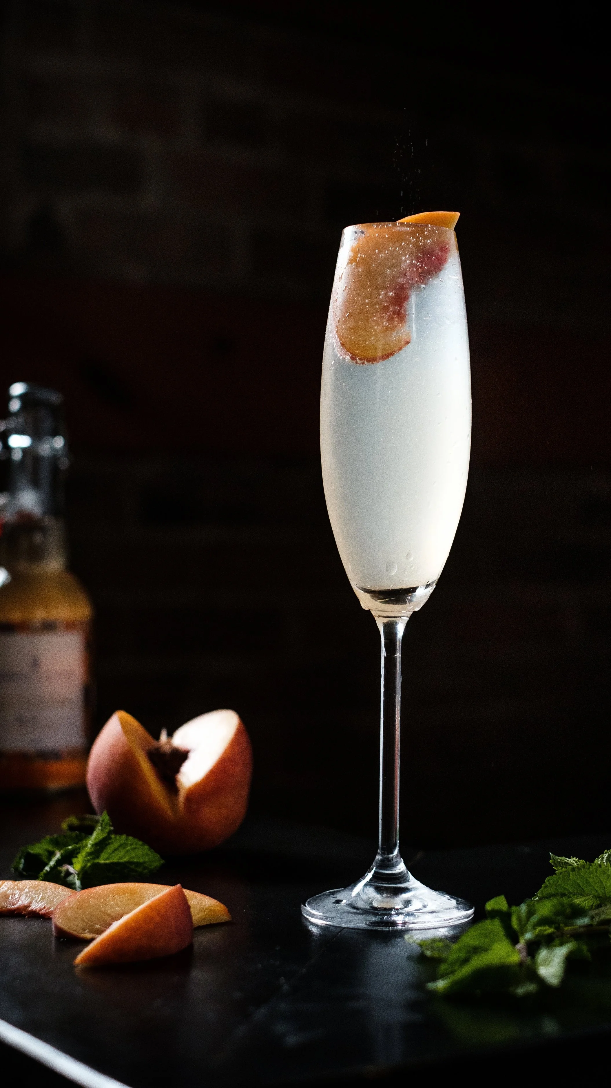 Add shrub, syrup and a dash of bitters. Top with Prosecco. Garnish and enjoy.